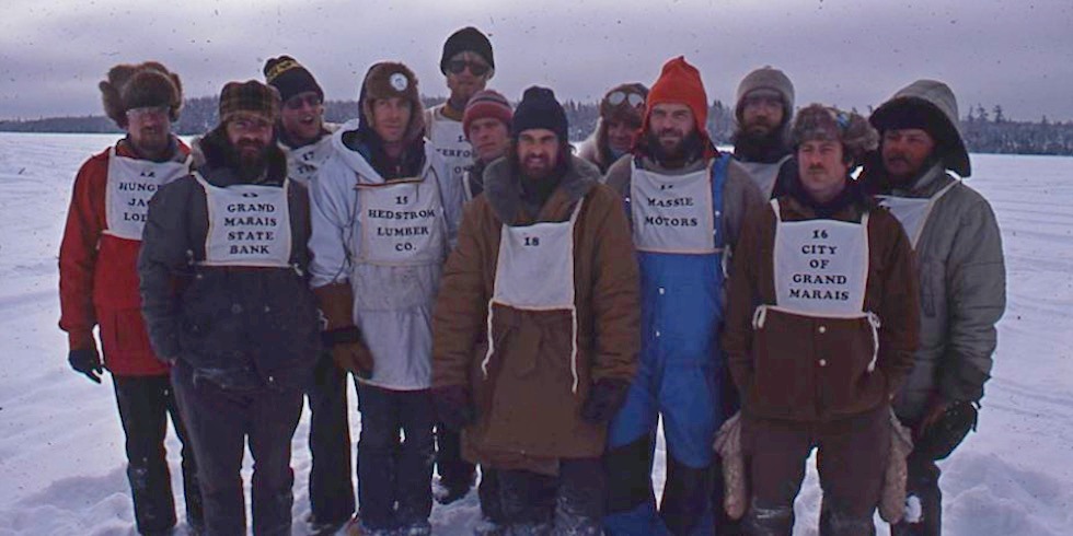 We had to change plans in subsequent years because our route through North and South Lake was a route through the Boundary Waters. It is illegal to run a competitive event within the Boundary Waters. Our map of the first race route included a dotted line through the Boundary Waters section with the explanation that we were not competing through that section. It was an argument that we knew would not hold up. Vince Eckroot was also an early supporter of the Mail Run. In our second year of running, a photo of our mass start in front of Windigo Lodge was featured in the Minneapolis Sunday Star Tribune’s Picture Magazine! It is a classic. Exactly how were put the trail together that year is somewhat unclear, but it also featured Hungry Jack Lake, West Bearskin, Flour, and East Bearskin. The race start in following years was put on by Jerry Parson of Hungry Jack Lodge. Throughout, Ted Young was the genius behind our route choices, and Mark Patten continued to provide that intrepid Elan snowmachine! Money was always hard to come by. The race one year hung in the balance for lack of funds. A “$100 Dollar Club” was formed. Our local group of mushers, each committed $100 to the cause, should it be needed. The race was a success. There were a couple of local mushers whose purse checks for their finish were a little short! Other than that, our bills were paid in full!